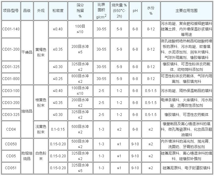 (3)橡胶工业用硅藻土功能填料:硅藻土特有的颗粒结构能使它在聚硅酮橡胶和机械橡胶等制品充当半增强材料,可提高或改善橡胶制品的耐热、耐磨、密封、防渗漏等性能。产品型号CD01、CD03、CD04和CD05四种硅藻土都能满足上述性能要求。